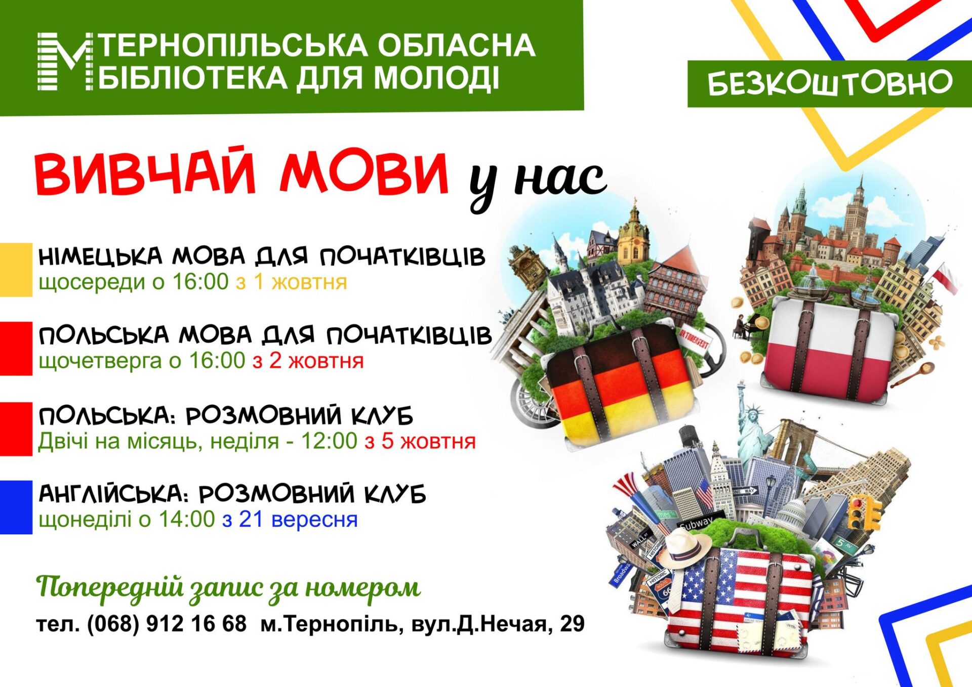 Хочете впевнено спілкуватися іноземною мовою? Приєднуйтеся до клубів вивчення іноземних мов у Тернопільській обласній бібліотеці для молоді. Навчання – безкоштовне, відбувається в режимі живого спілкування, практики з однодумцями, дружній атмосфері та підтримці.